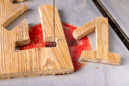 Cutting wood with a table jigsaw. Cutting complex shapes in a wooden board. Workshop workplace.