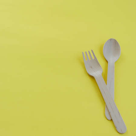 Bamboo wooden spoons and forks on yellow background with space for text. Eco friendly kitchen utensils. Ecological concept