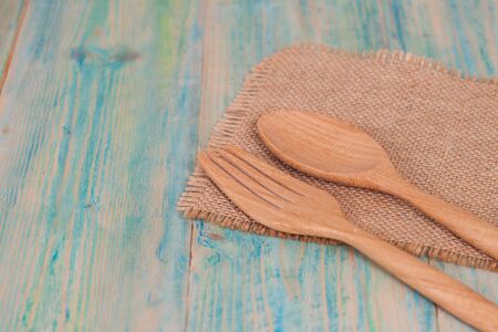 Pieces of disposable wooden cutlery on a blue table