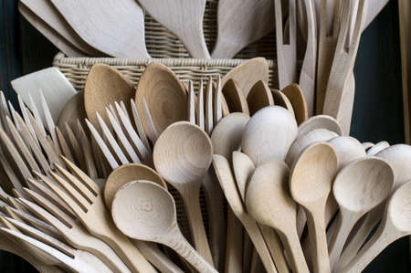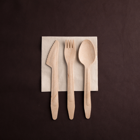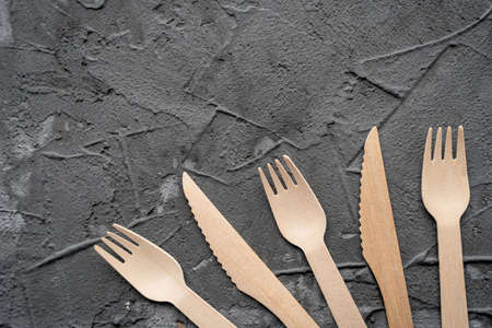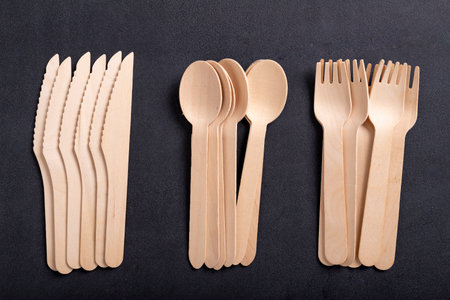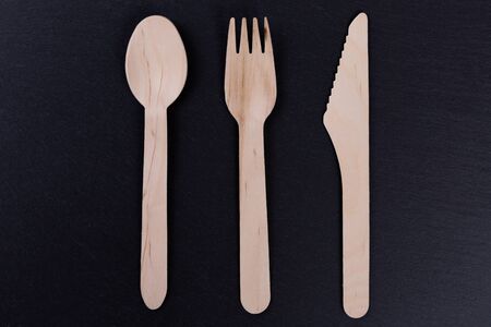 Wooden cutlery on the table. Utensils used in the fast food bar. Dark background.