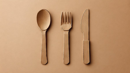 Eco-friendly biodegradable wooden cutlery, forks, knives and spoons on a beige background. Ecological lifestyle. No waste, conscious environmental care. Place for text