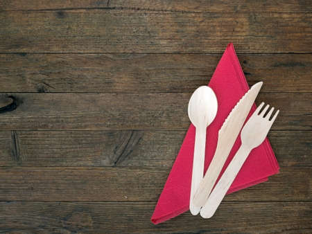 Ecological cutlery and red napkin, serviette. With copyspace.