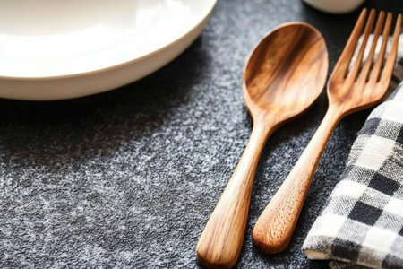 Wooden utensils and a plate arranged on a textured table in a dining setting