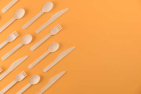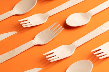 Disposable wooden cutlery on a orange background. Environmentally friendly materials.