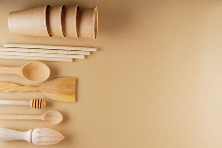 Set of eco friendly wooden bamboo cutlery on beige background. Plastic free concept. Disposable paper cups and wooden kitchenware on earth color background. Zero waste concept