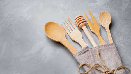 Wooden cutlery on a gray background. Spoon, fork and wooden stick for honey in a linen napkin tied with twine. Eco friendly cutlery concept. copy space