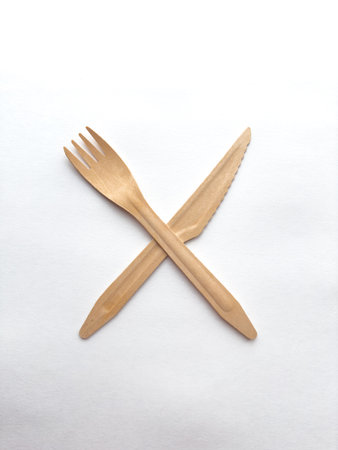 Eco friendly wooden cutlery. Sustainable knife and fork on white background