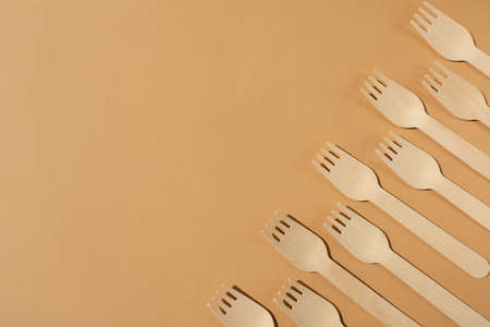 Wooden forks on a beige or brown background. Contrast lighting. Flat lay. Eco friendly wooden cutlery. Plastic Free Concept.
