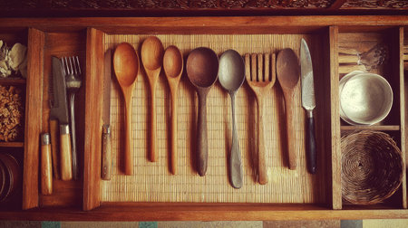 A beautifully arranged collection of wooden and metal cooking utensils displayed in a kitchen drawer, creating a warm and inviting atmosphere.