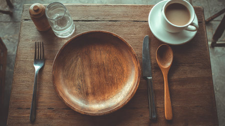 A serene dining setup featuring a wooden plate and cutlery arranged on a rustic table. Accompanied by a cup of coffee and a glass of water, this image captures a simple yet inviting atmosphere perfect for a cozy meal.