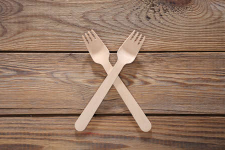 Wooden forks on a wooden table. top view