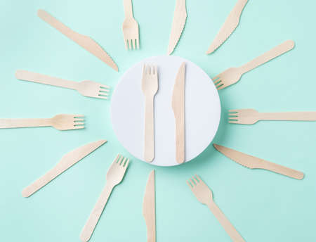 Eco-friendly disposable utensils made of bamboo wood and paper Draped spoons, fork, knives, bamboo bowls and other.Copy space.Disposable cutlery on a pressed paper plate on a background.