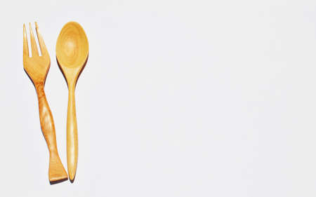 brown wooden spoons and fork on white background