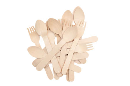 Wooden spoons and forks isolated on white background