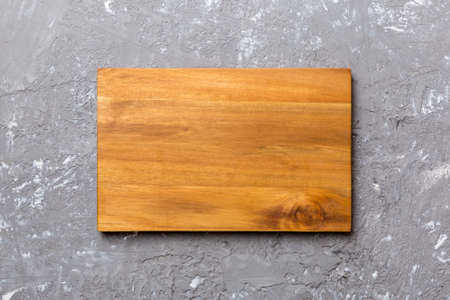 Top view of wooden cutting board on cement background. Empty space for your design.