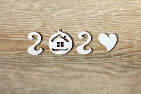 house and heart form the number two thousand twenty on a wooden surface top view. anniversary year for honeymoon