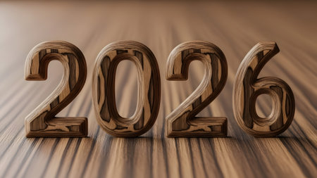 3D wooden numbers spelling out 2026 on a striped wooden surface. Clear details and vibrant colors...