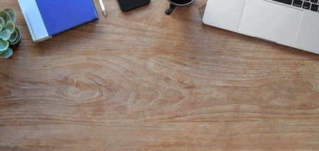 Top view of wooden table with copy space, coffee cup and supplies in office room