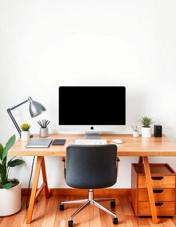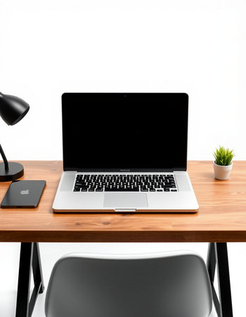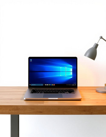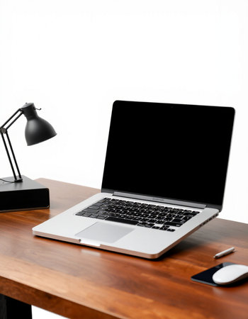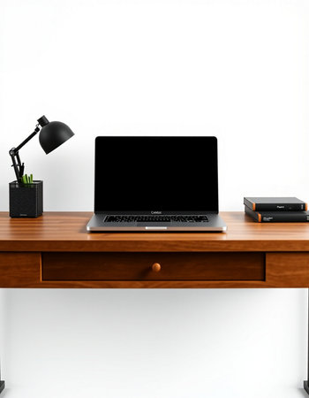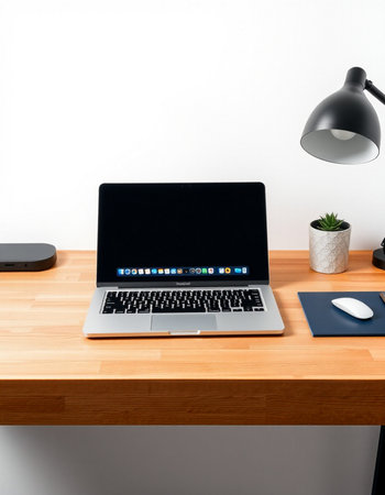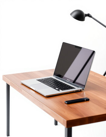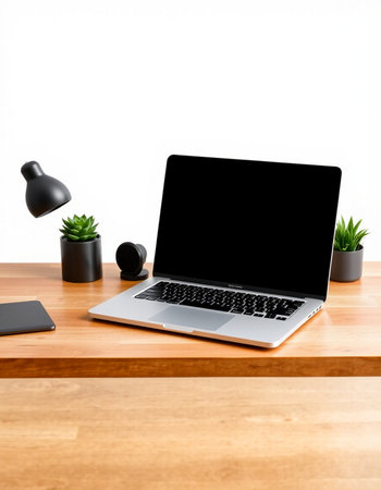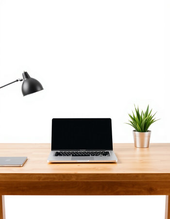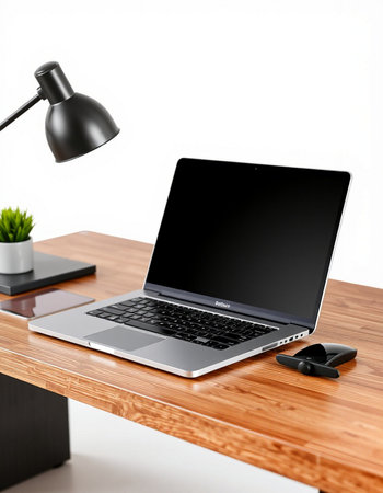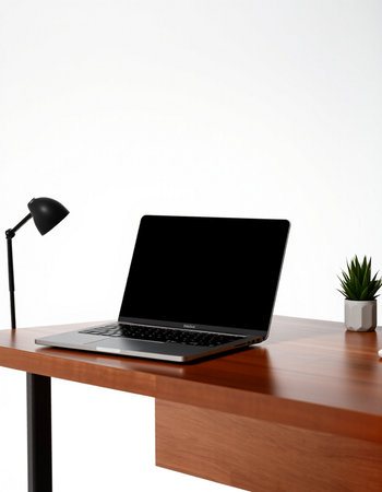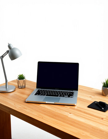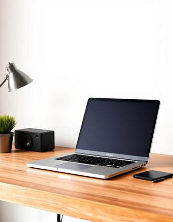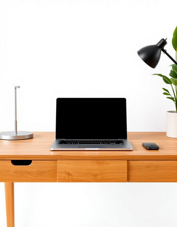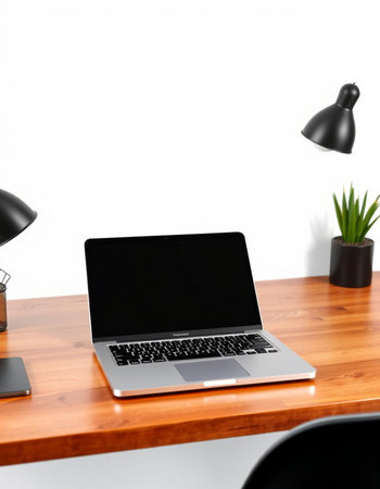 Laptop with blank screen on wooden desk and lamp on white wall background