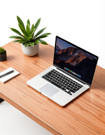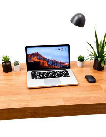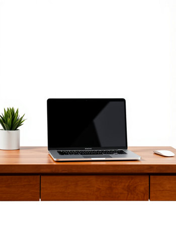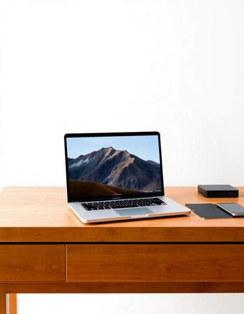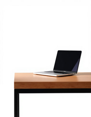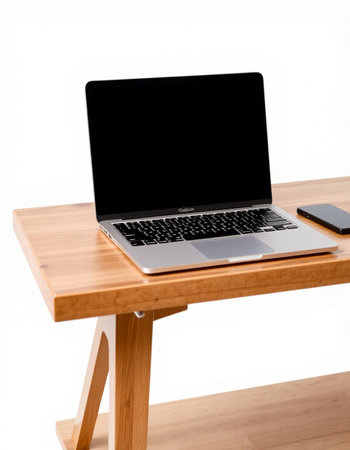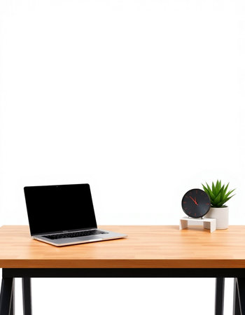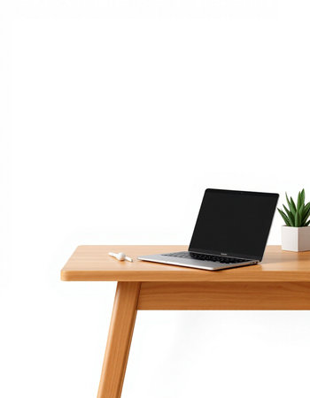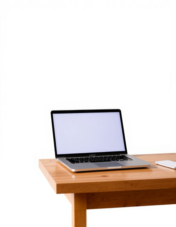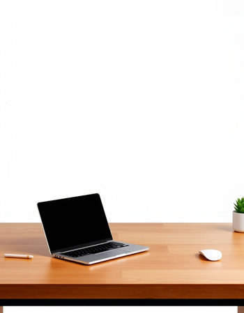 Modern workspace with laptop on wooden table and white background. 3d rendering.