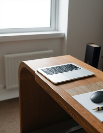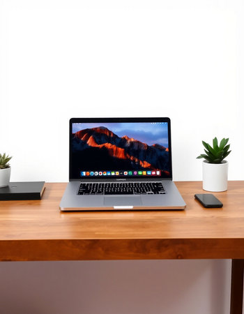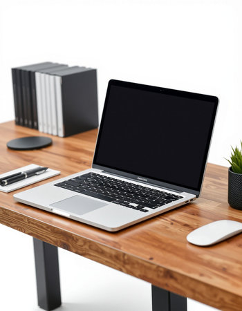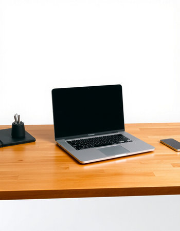 Modern workplace with blank laptop on wooden table. 3D Rendering
