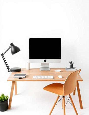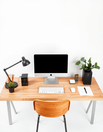 Modern workspace with computer, keyboard, mouse, lamp and other items.