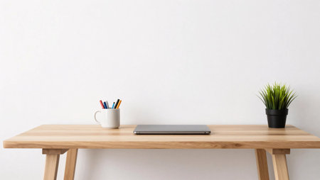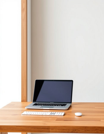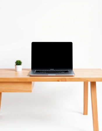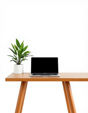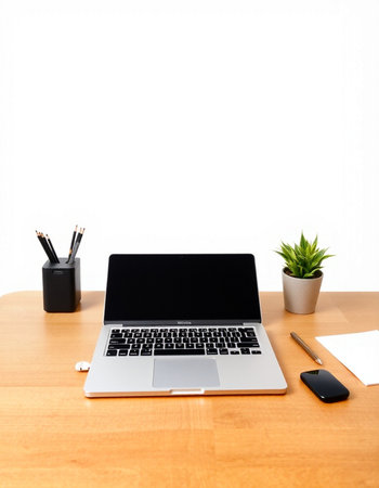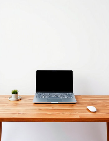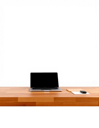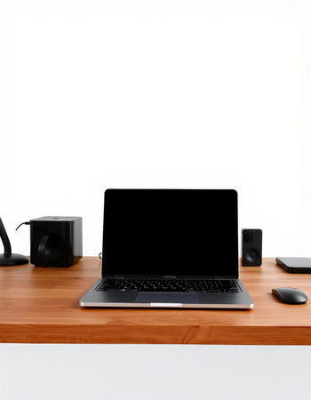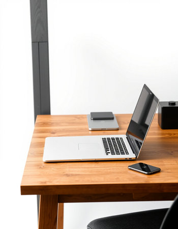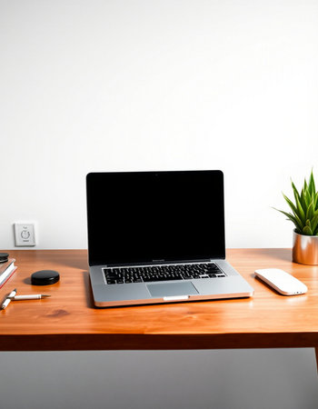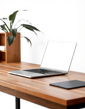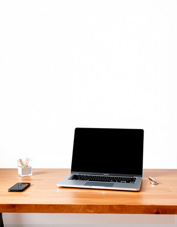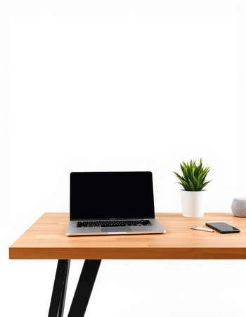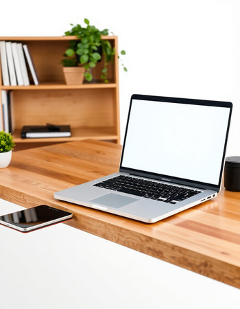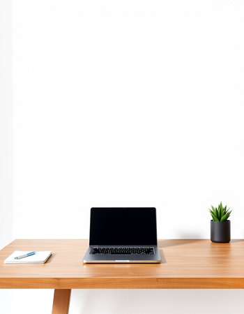Modern workplace with blank screen laptop computer on wood table and white wall background