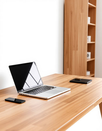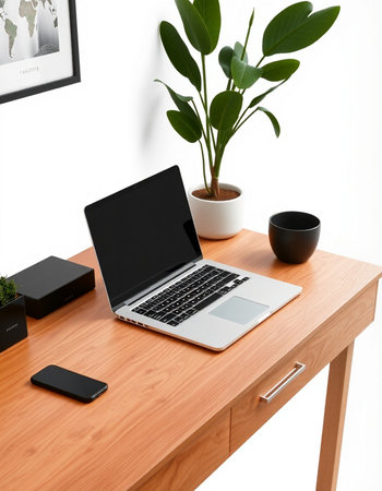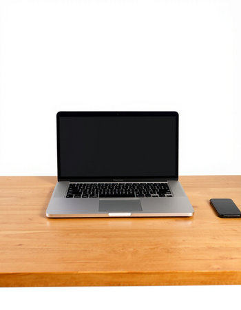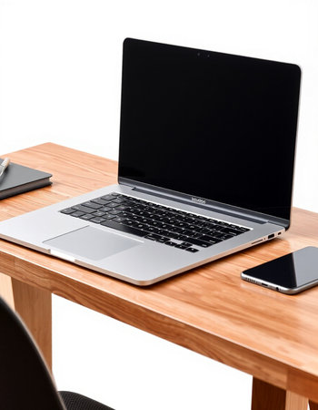 Modern workplace with blank laptop, smartphone and coffee cup on wooden table.