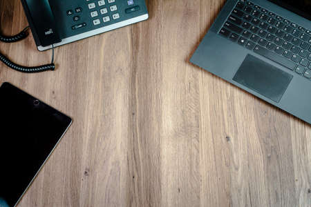 Laptop and mobile phone on wooden table in office. Workplace concept