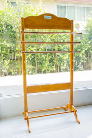 Old-fashioned authentic standing wooden laundry rack with clothes in the Netherlands
