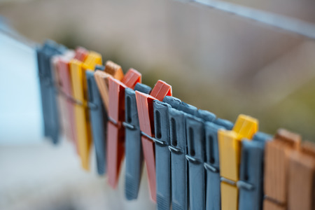 Tweezers for clothes on an indoor clothesline, detail of clothing accessories