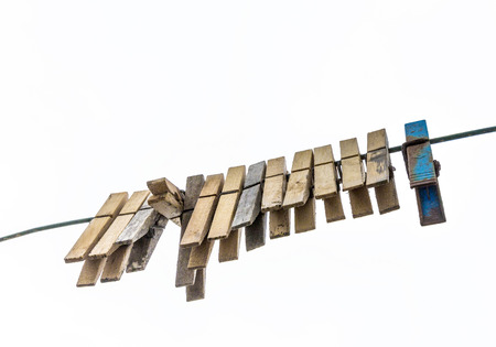 three wooden clothespins with a metal spring hang on a rope on a white background. selective focus