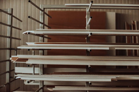 A vast warehouse in the forestry industry, showcasing a plethora of wooden products, including boards and various timber items neatly organized in storage