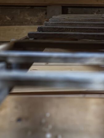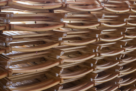 Stacks of new wooden bases with simple legs for elegant chairs assembling in light paint spraying booth at workshop extreme closeup