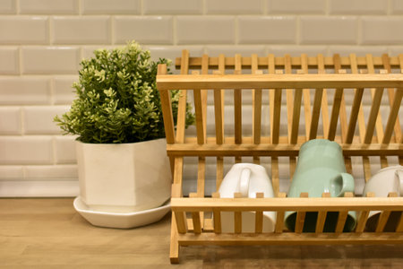 Fragment of kitchen interior in beige tones. Glass on wooden dish drainer against background of brick wall of kitchen. Wooden dish rack and tea cups in modern kitchen interior. Selective focus