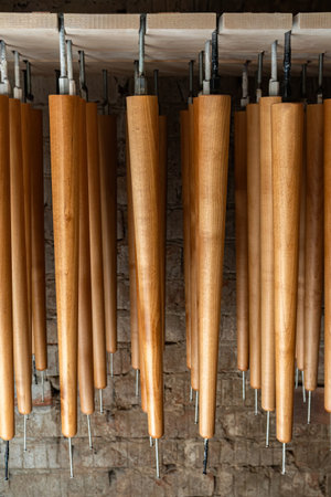 Collection of new wooden furniture legs drying after applying varnish hanging in wood workshop close view