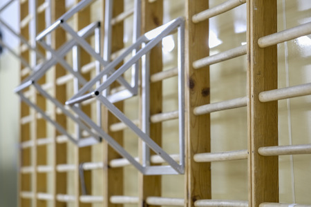 Vintage view of colorful Clothes pegs pinned to a bench with red wall in a background hanging on a clothes rack