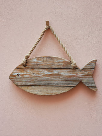 A wooden fish sign suspended by rope on a soft pastel wall, ideal for adding a nautical touch to interior spaces with a coastal theme.