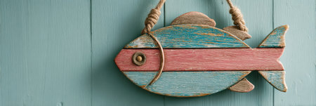 Colorful wooden fish sign decorated with rope is hanging on a pastel wall, creating a charming accent piece in a coastal-themed environment