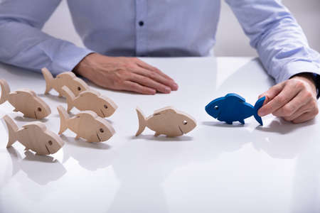 Group of fishes swimming to the fishing rod, red fish makes his own decision and takes a different direction, against the stream symbolic, courage and winner concept