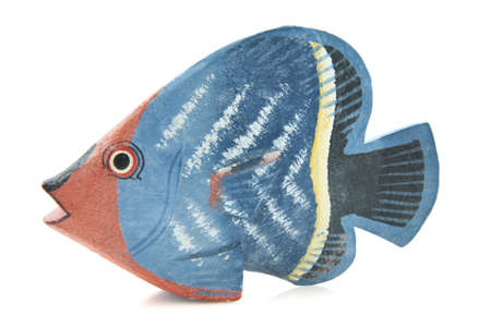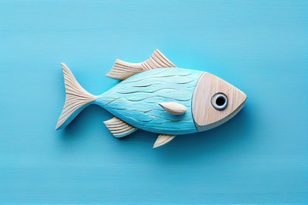 Toys wooden carved fish on a blue insulated background. Generative AI
