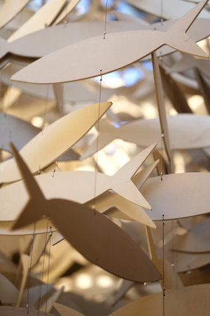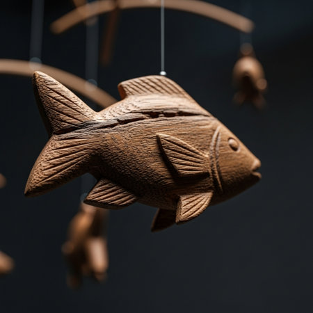 Editorial close-up study of an aged, hand-carved wooden fish component designed for a mobile or kine