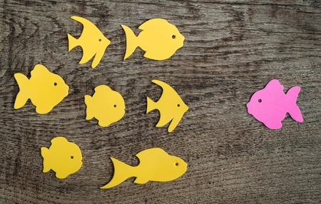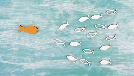 Orange fish is the leader of the group, leadership and teamwork concept, be a winner, success and start up in business, follow a new idea