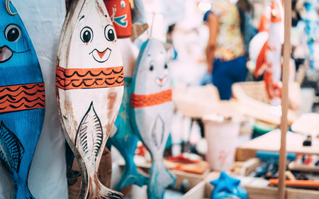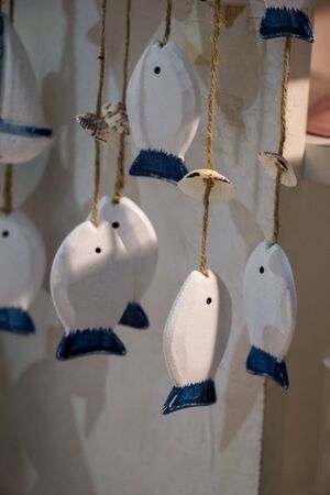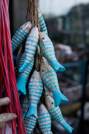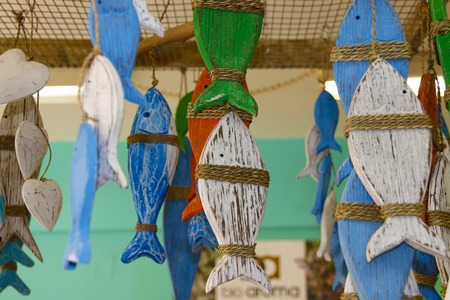 Beautiful wooden fishes for sale on a street of Mediterranean town of Collioure, Southern France