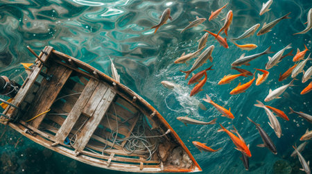 An aerial view of a wooden boat floating in turquoise water, surrounded by colorful koi fish swimming gracefully below.