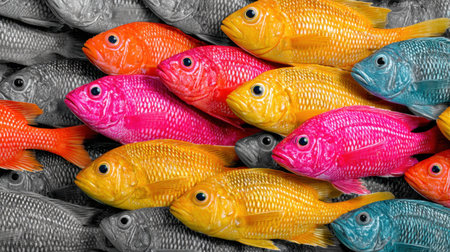 Colorful fish create vibrant underwater scene, showcasing mix of bright hues like pink, orange, and yellow against monochrome background. This striking contrast evokes sense of joy and liveliness