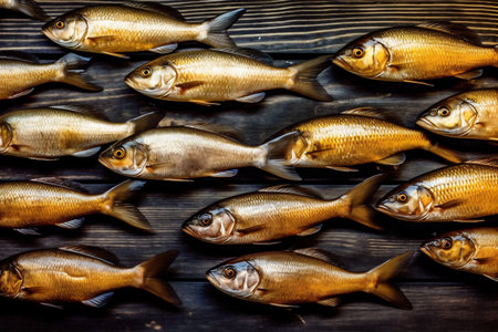 fresh fish lies on a rustic wood table, its scales glistening in the light, surrounded by scattered fresh parsley and lemon slices, evoking a sense of seafood culinary delight, perfect for a summer dinner party or a seafood restaurant menu. ai generated