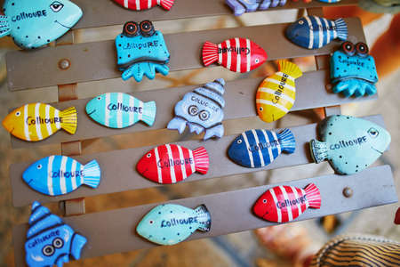 Beautiful magnetic fishes for sale on a street of Mediterranean town of Collioure, Southern France