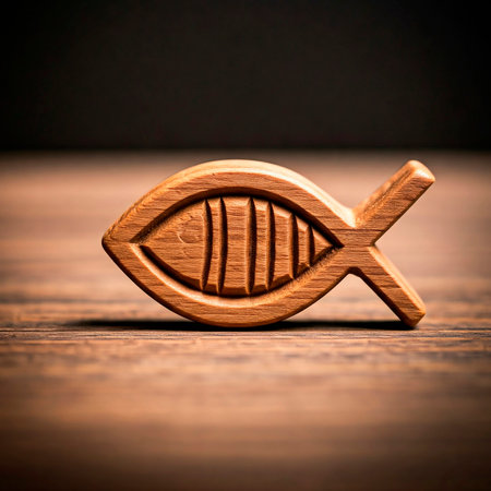 Wooden Christian fish symbol on a wooden background. Christian religion concept.