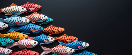 AI Generated. Colorful paper fish arranged on a black background with customer feedback focus and copy space for text